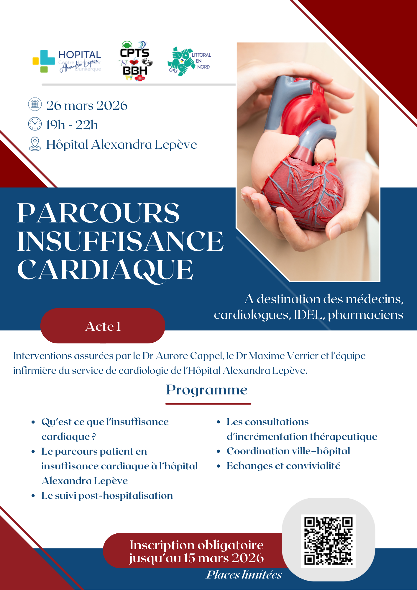 La CPTS Littoral en Nord & la CPTS BBH, en partenariat avec le Centre Hospitalier Alexandra Lepève, vous invite à une soirée dédiée au parcours de soins en insuffisance cardiaque, le :
